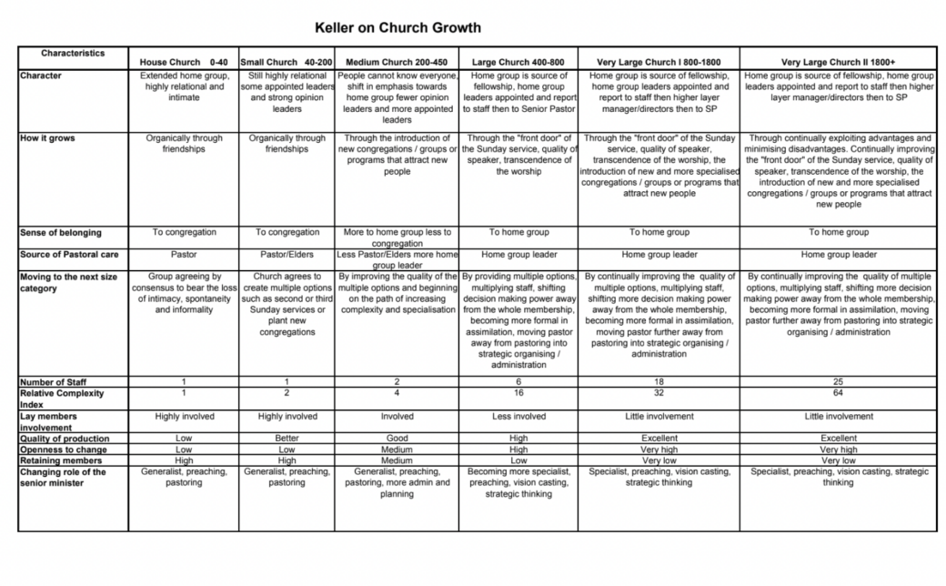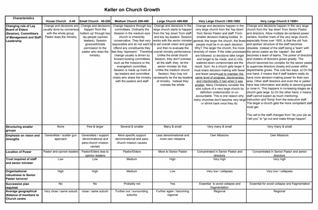 Our manual for thinking about growth and the structures to accommodate it — flagged right from the first vision document approved by the leadership in 2011 — was Tim Keller’s paper ‘Leadership and Church Size Dynamics: How Strategy Changes with Growth’ published in 2006. What Keller described; we prescribed and attempted to systematise. It’s an interesting paper — and particularly interesting to read after Keller’s retirement from Redeemer; where the megachurch that had gatherered around his leadership became a decentralised into a ‘family network’ of autonomous churches (a change announced in 2014).